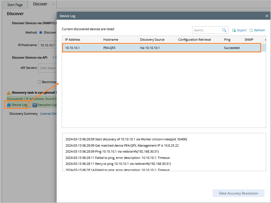 If the discovery task is completed successfully in Execution Log, you can click on Device Log to view the discovery result for each device. You can pay attention to the live access status for each device, such as Ping, SNMP and Telnet/SSH. To troubleshoot the discovery issues for a certain device, you can click on the target device to view the access log for this device. Live access issues or incompatible drivers are usually the reason for errors in the device log.