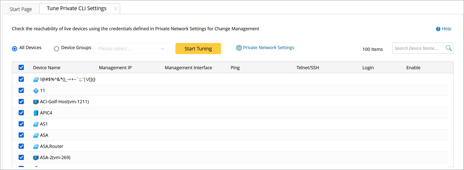 Tuning private network settings enables you to check the real-time reachability of devices to validate the private access credentials defined in the Private Network Settings. After tuning, the private credentials will be recorded in the Private CLI Settings for each successfully accessed device.