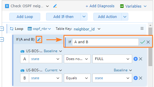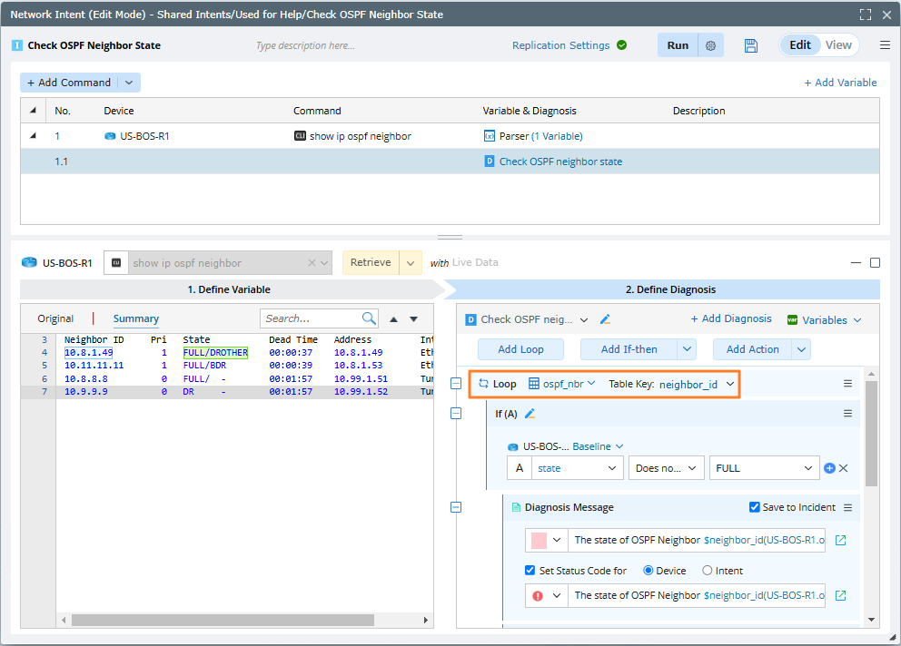 A variable can be a single variable such as $state or a table (paragraph, collector). For the table/paragraph/collector variable, you can add the Loop node for the system to loop through each table's row. Take the OSPF neighbor table as an example. There are four lines of neighbor information in the CLI result (the blue rows on the left). The diagnosis execution will determine whether the state contains full line by line (four lines in total).