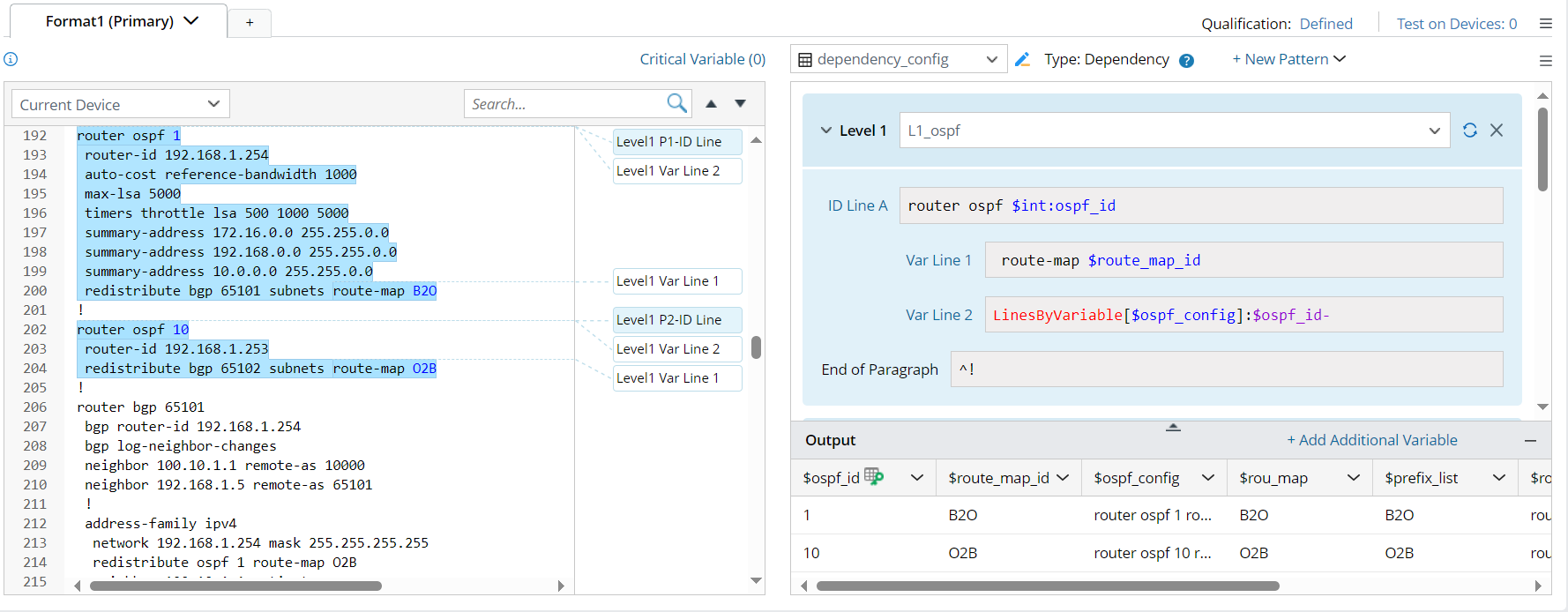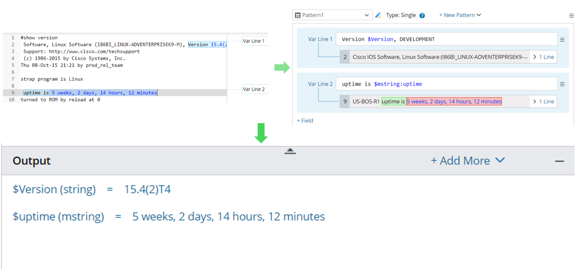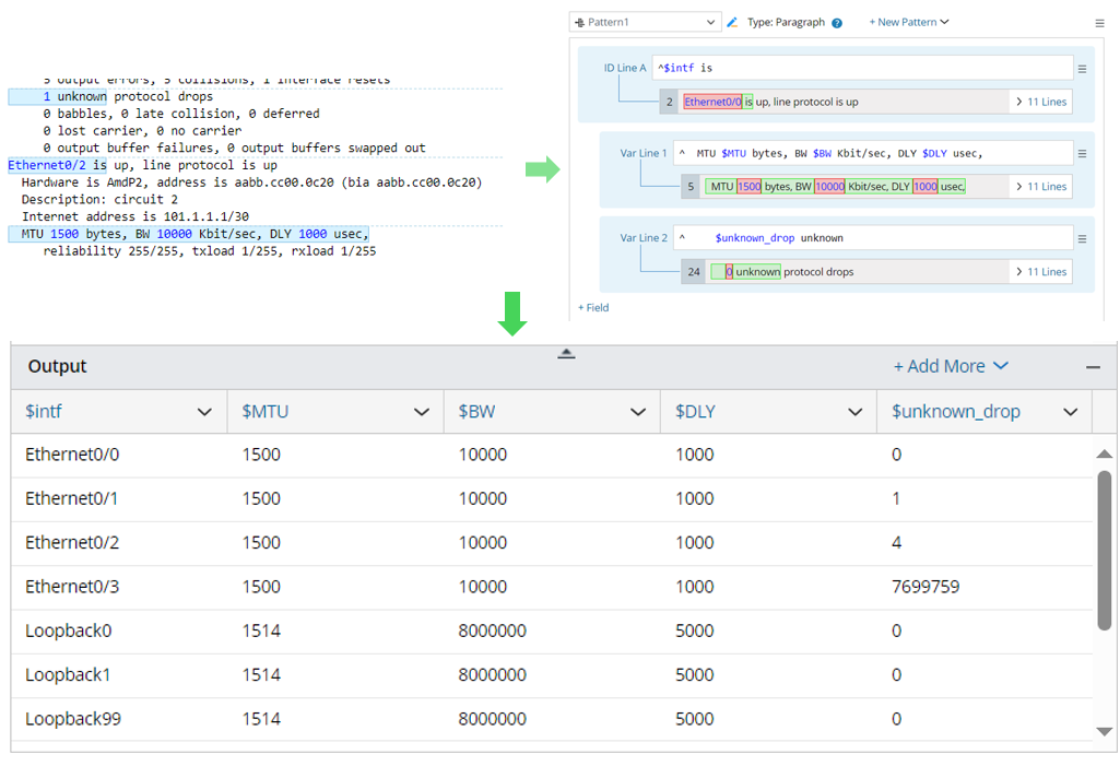 A Paragraph Parser can parse variables in recurring paragraphs, such as collisions and CRC errors for interfaces, etc., by anchoring paragraph identifier (ID) lines. See Define a Paragraph Parser for more details.