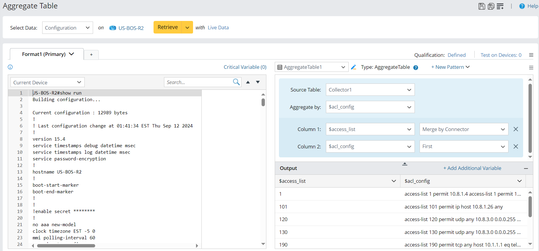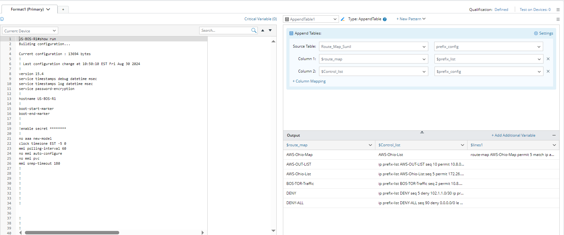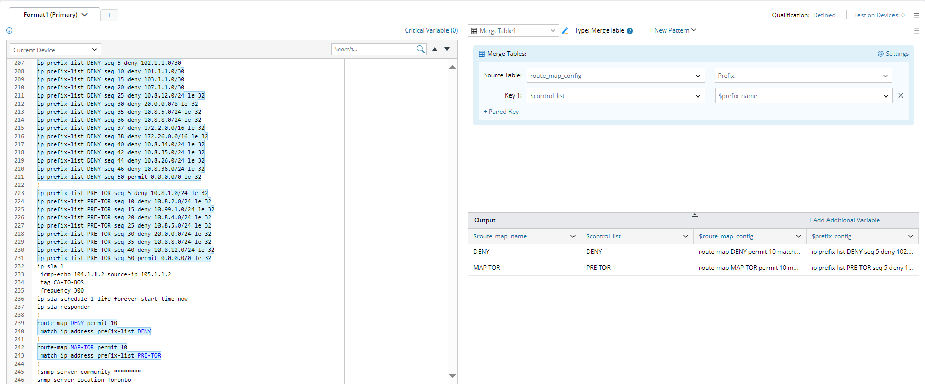 In the Merge Table pattern, you can merge the table variables from two parser output tables by paired keys, enabling the combination of configlets from different paragraphs as well.