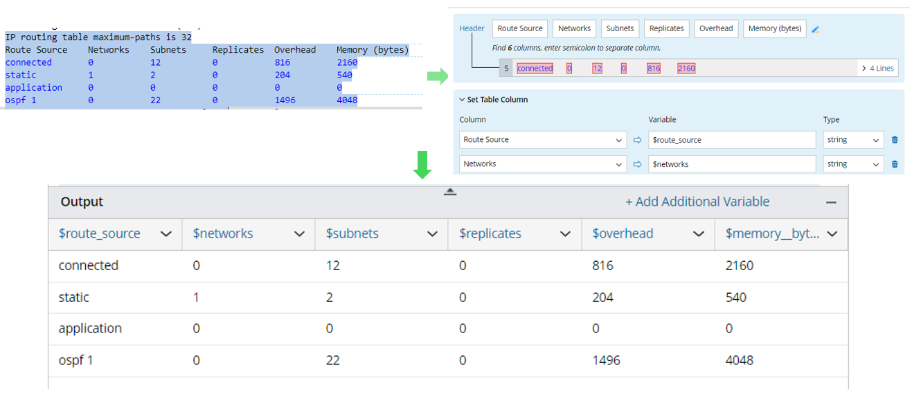 A Table Parser can parse table-formatted text, such as NDP tables and VRF tables. See Define a Table Parser for more details.