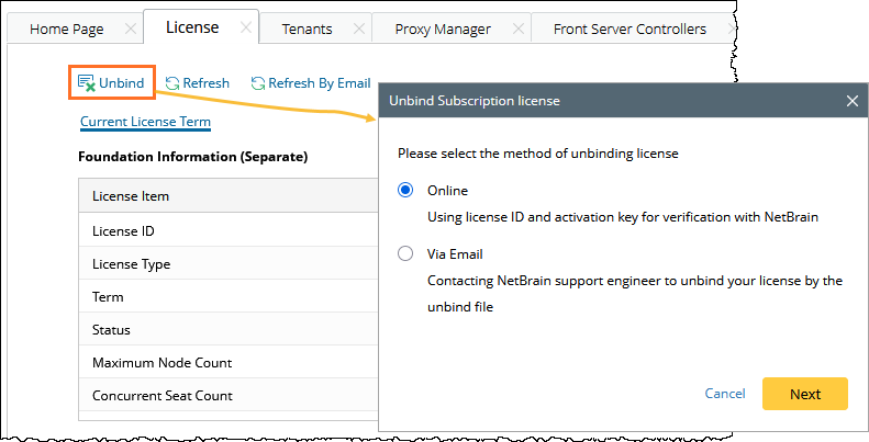 - Online: Unbind it from both your local machine and NetBrain License Server synchronously.