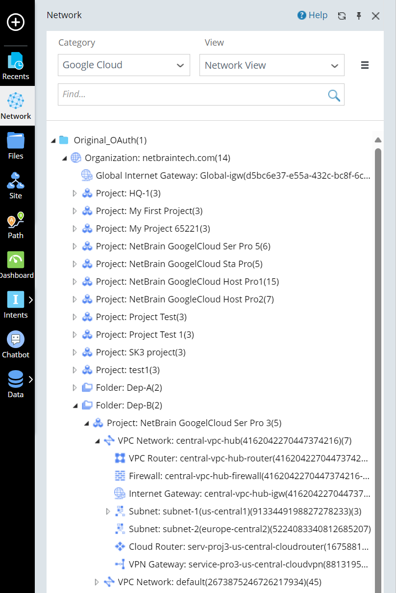 - In the Network pane, select Google Cloud > Network View. The hierarchy view of the GCP data model is organized in this order: Organization > Folder > Project > VPC Network.
