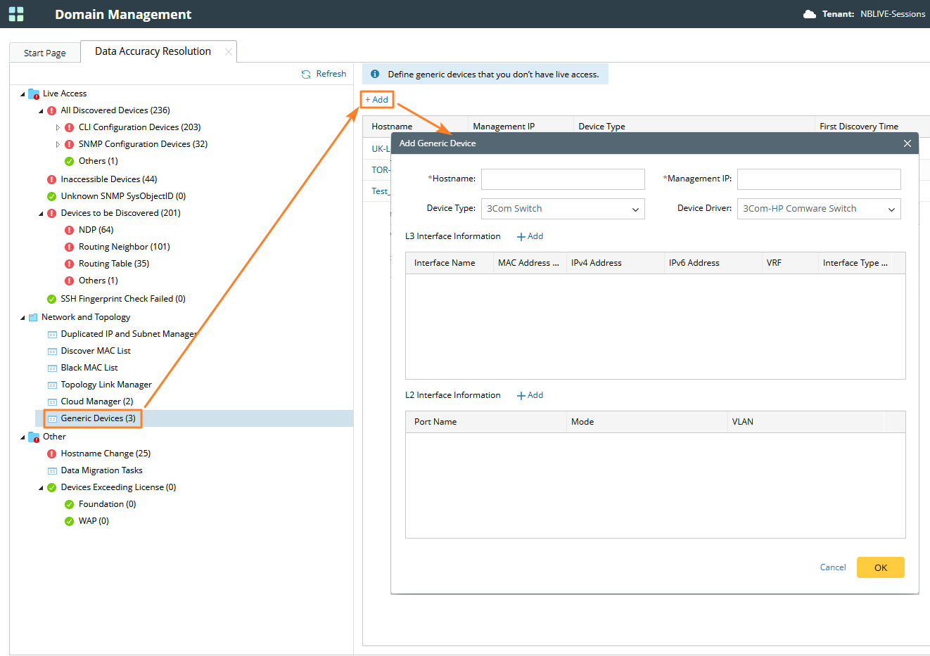1) In the Add Generic Device pane, enter the hostname and management IP, and select the device type from the drop-down list. The device driver is automatically selected based on the device type.