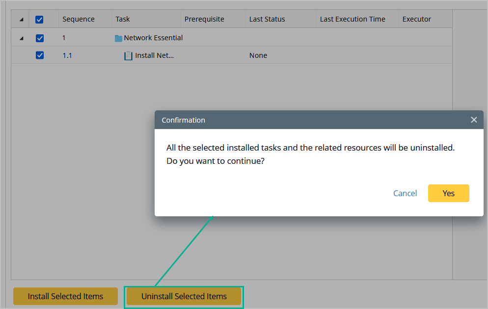 You can uninstall only one task at a time. You will be asked to confirm the affected assets to be deleted during uninstallation.