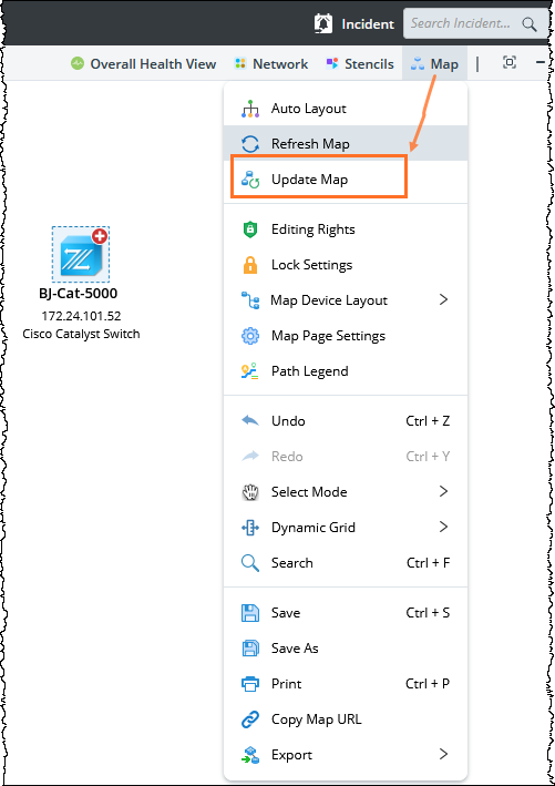- Map Layout (applies only to site and device group maps): Updates the positions of devices on the map to reflect layout changes.