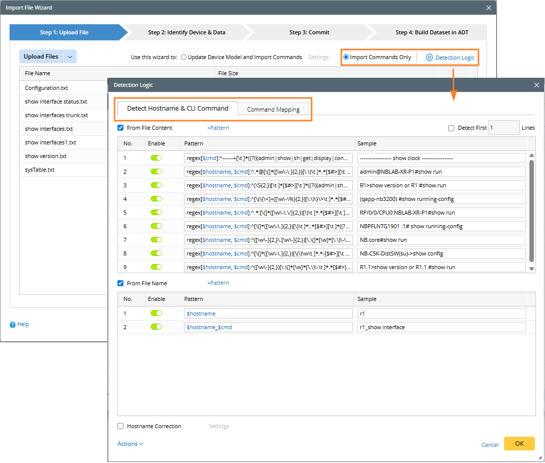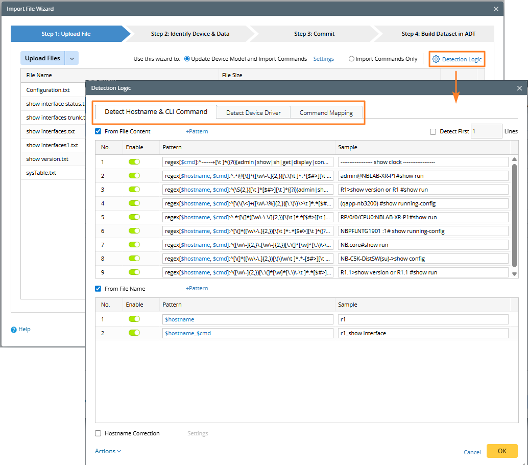 In this step, you can upload the text files of the device CLI commands and define the logic of how to detect device commands from these files.