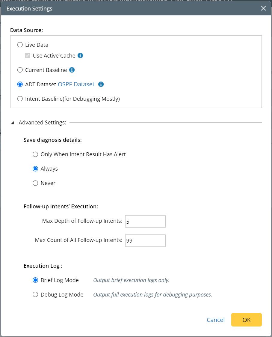 Note: For running triggered diagnosis in TAF, you cannot configure the execution log mode. The brief log is used by default. |