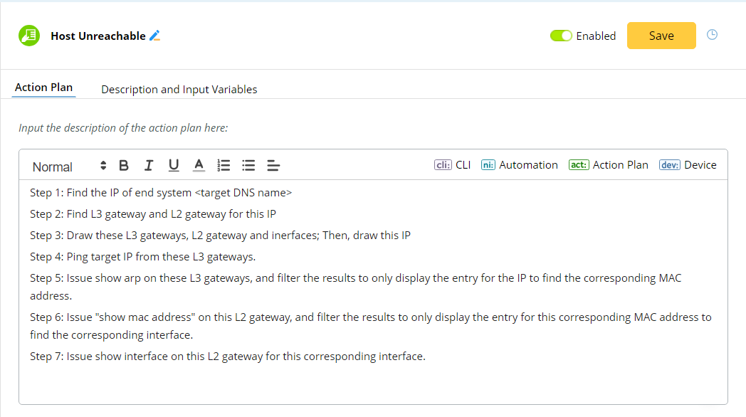 Define the action plan to troubleshoot a reachable issue. Use a bracket when describing the input of variables.