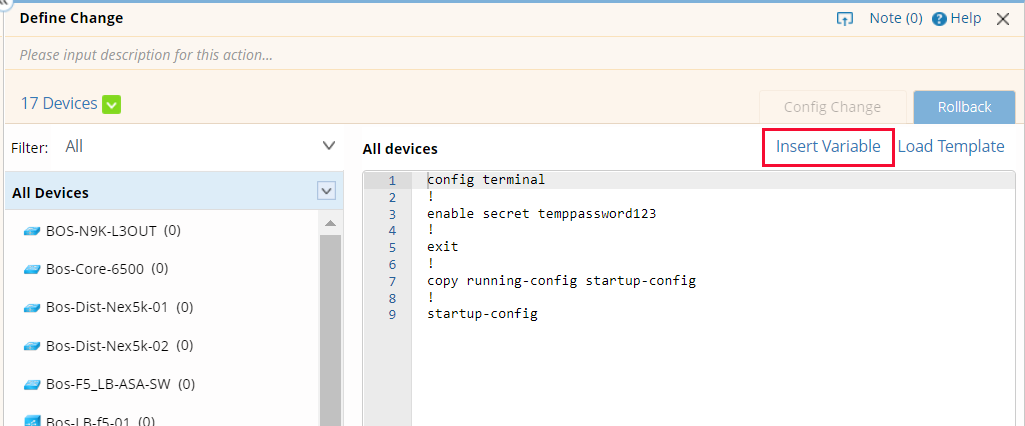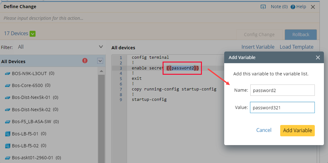 - Enter the value of the variable. The value will be decrypted to form the actual commands sent to the device when the system executes the changes.