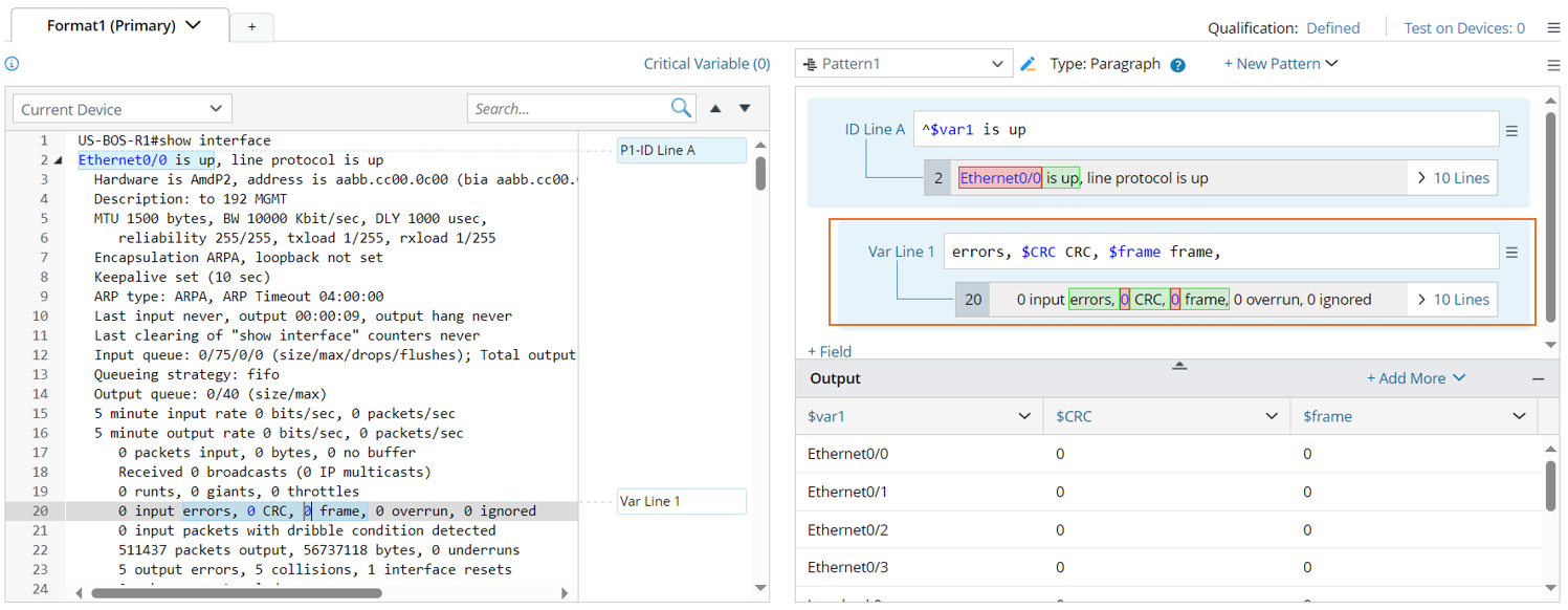 For example, to parse metrics like CRC, input errors, frame, etc., for each interface of which the status is up, you can define "errors, $int:CRC CRC, $int:frame frame" as the Var Line pattern.