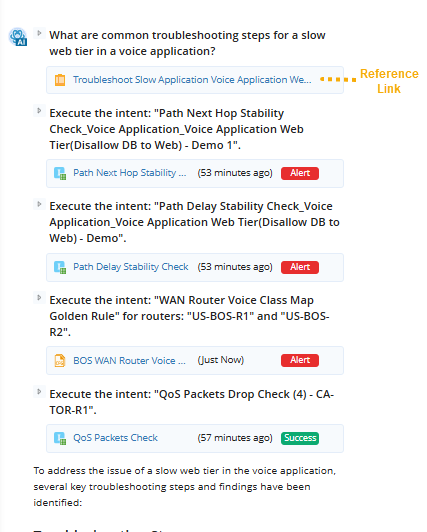 Sub-questions: The prompt is broken down into sub-questions based on a knowledge document or the LLM's reasoning. The LLM will generate answers for each sub-question and may include reference links to intents or knowledge documents.