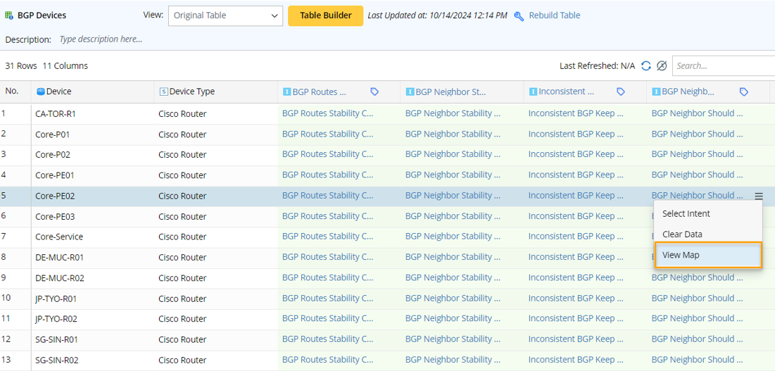 Intent Map Output is generated during the intent execution, which includes Draw Map logic and intent data view, and intent status codes can be automatically added as part of the intent data view. The intent output map changes with the update of intent execution results and serves to show intent diagnosis details to help troubleshoot and analyze network issues. Both base table and column group can contain “Intent Output Map”. For an ADT with intent column, you can open to view the map from intent column.
