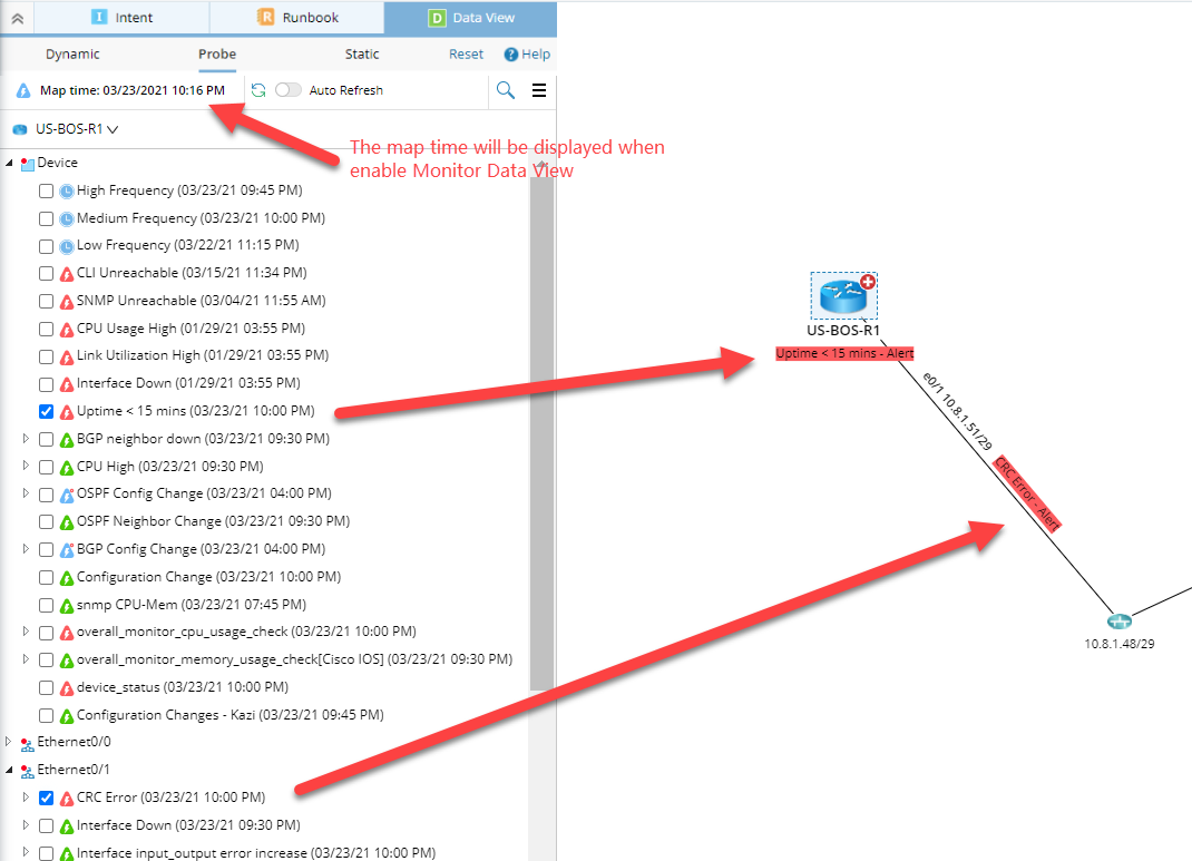 For example, the device “R1” and “R2” have Flash Probe “uptime < 15 mins” executed at different time points. If the map time is 11:20 AM 1/21/2021, the result of “uptime < 15 mins of R1 and R2” to be displayed is highlighted in the table below: