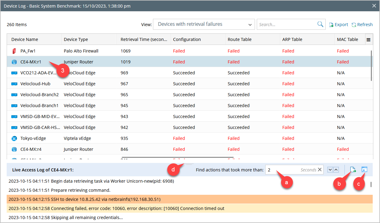 - Click Export to export the log files. In the exported log file, the Retrieval Time (seconds) column now appears next to the Device Type column.