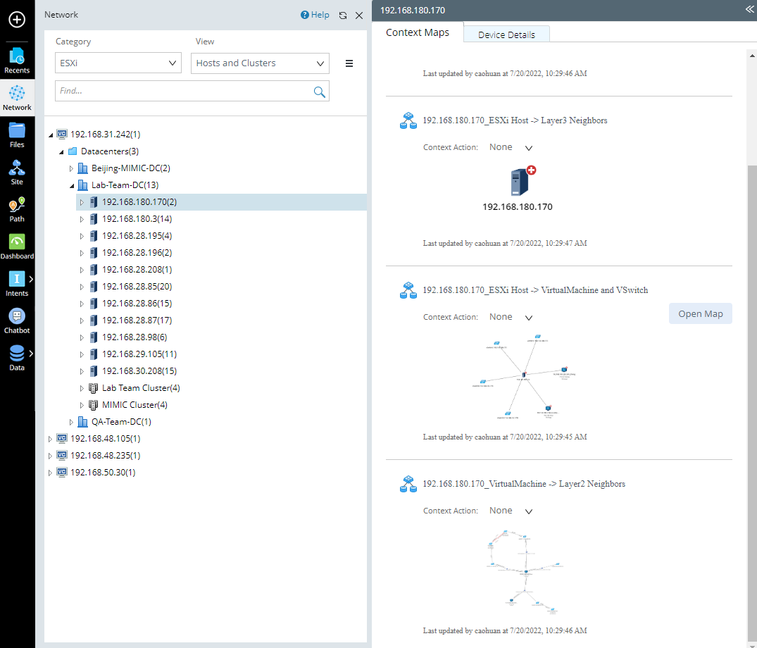 Tip: For more context maps supported under the Hosts and Clusters View, see Context Maps for details. |