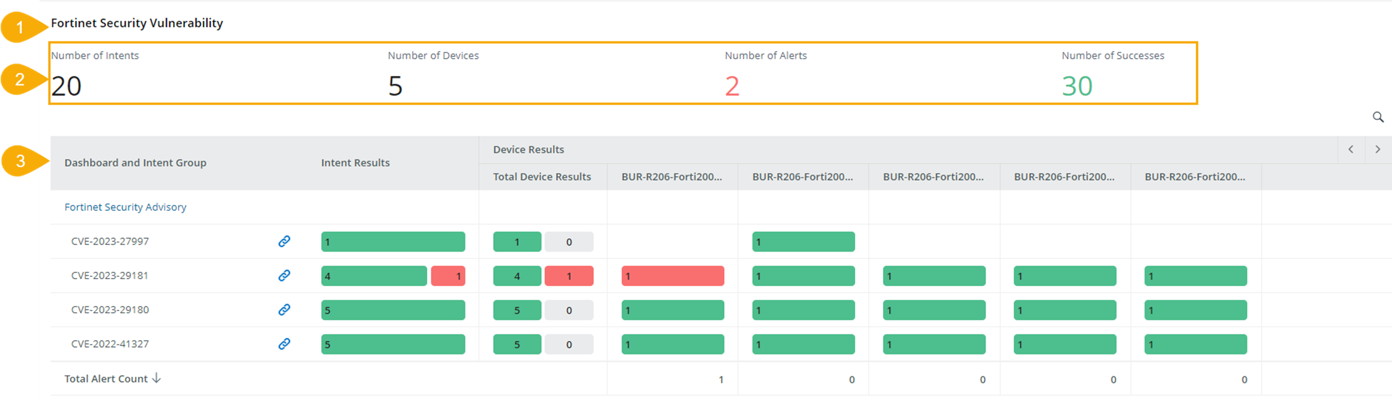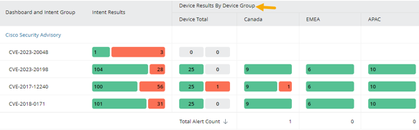 Click a red bar in the device column to view the total alert status code count for this device in the intent group.