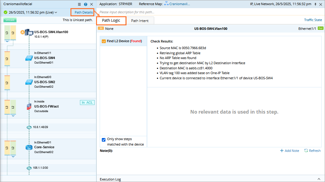 - Path Logic Pane: Show the data used in Path Discovery, including the device information, the interface information, and the execution log (which is fully displayed). You can write notes for each path hop.