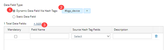 - Define a field name and select its source Hash Tag fields. For example, enter device_name and select #hostname as the source Hash Tag field, so the value of the #hostname will pass to the device_name data field.