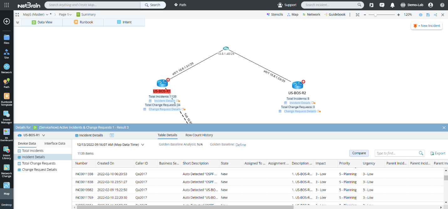 Below is an example representation of the ServiceNow all Incident and Change Requests data overlay on each device in NetBrain.