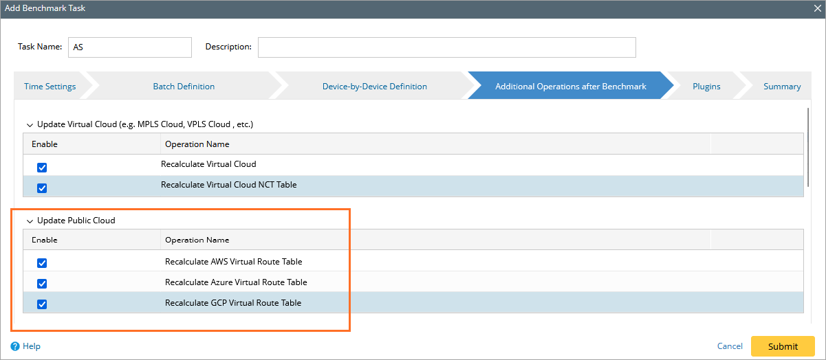 In the Update Public Cloud area of Additional Operations after Benchmark tab, make sure both Recalculate AWS Virtual Route Table and Recalculate Azure Virtual Route Table are selected.