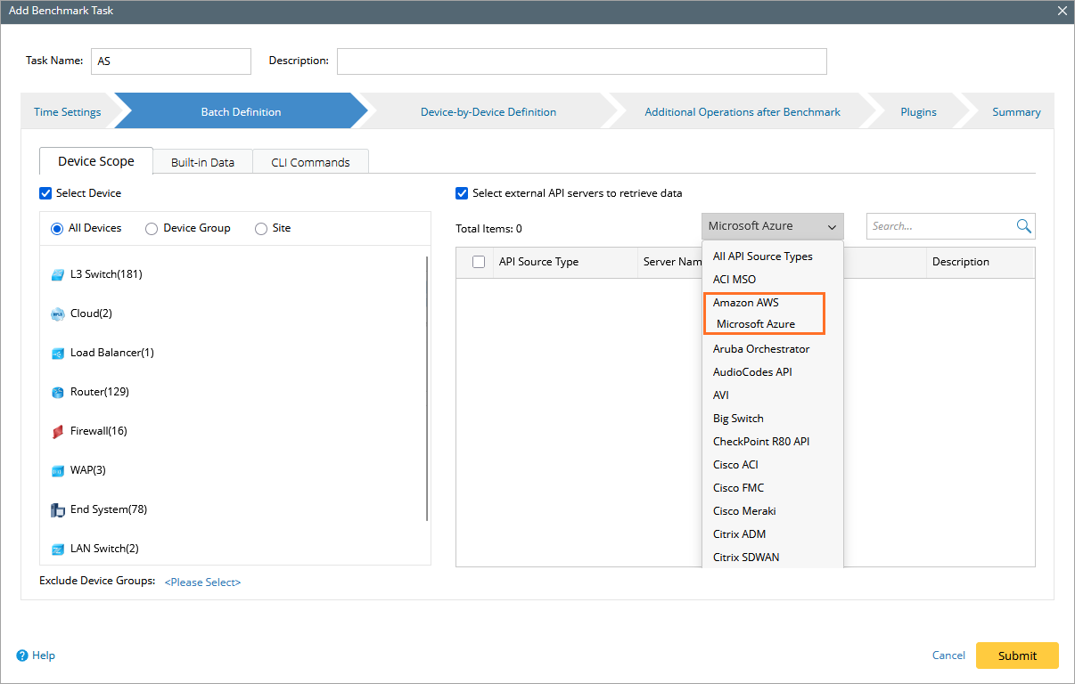 If the AWS and Azure networks are connected to your on-prem network via L3 VPN, you can use NetBrain to discover both of them. As shown in the diagram below, you need to make sure AWS and Azure are in the same benchmark task to get the entire public cloud data updated: