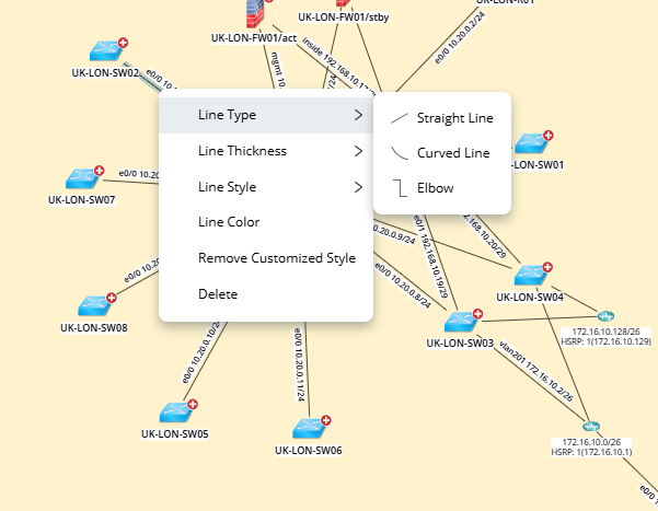 NetBrain provides three line types (Straight Line, Curved Line, Elbow) for links on map to enhance map layout and organize links more neatly.