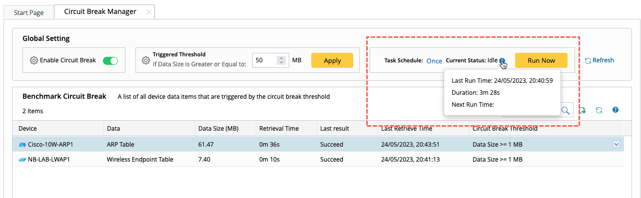 Click Run Now and the current status summary can be seen after the circuit break benchmark is finished.