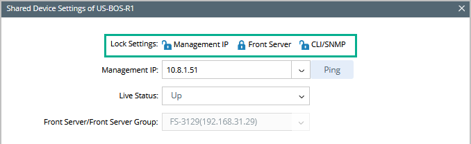 - To change Management IP or Front Server, select an item from the corresponding list and click Ping. The system will use the Front Server to ping the corresponding interface and automatically update the Live Status field with the ping result.