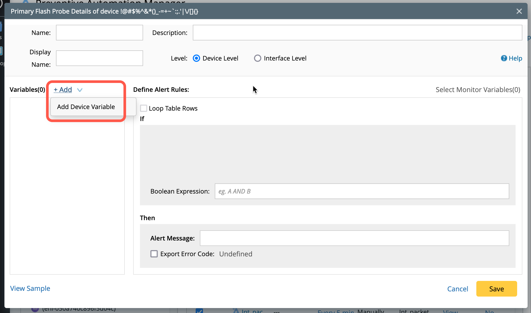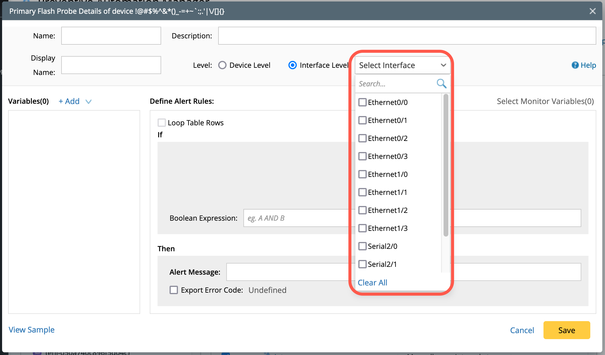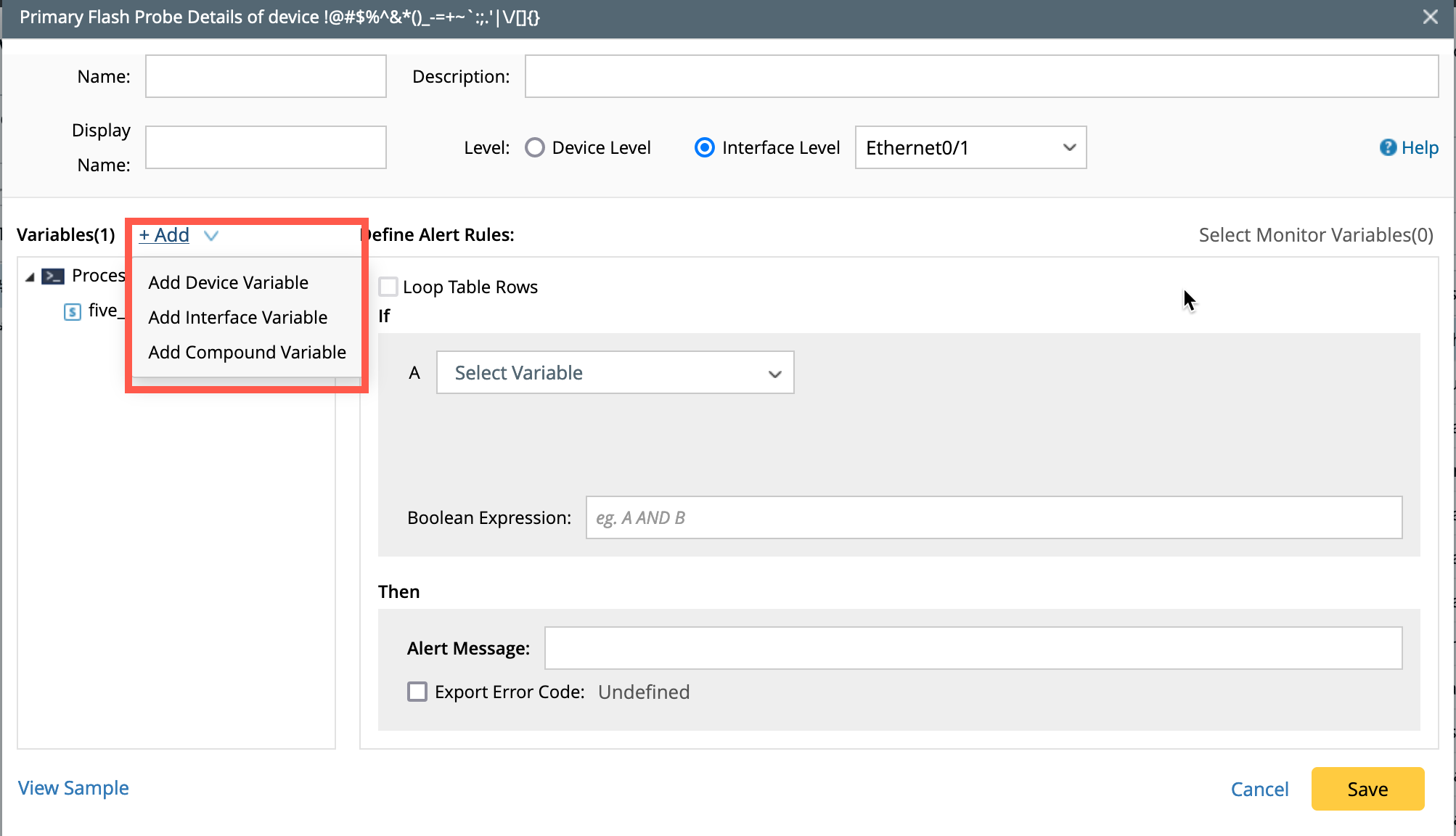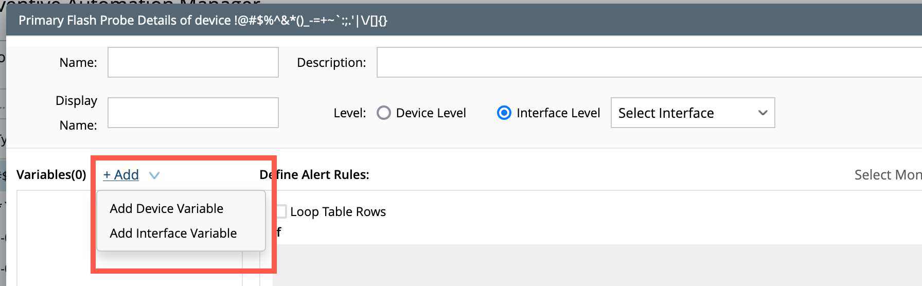 - When the level is set at the Interface Level: Select Add Device Variable or Add Interface Variable from the drop-down. Search the variable by the keyword (of the variable or command) and select the variables. Click OK.