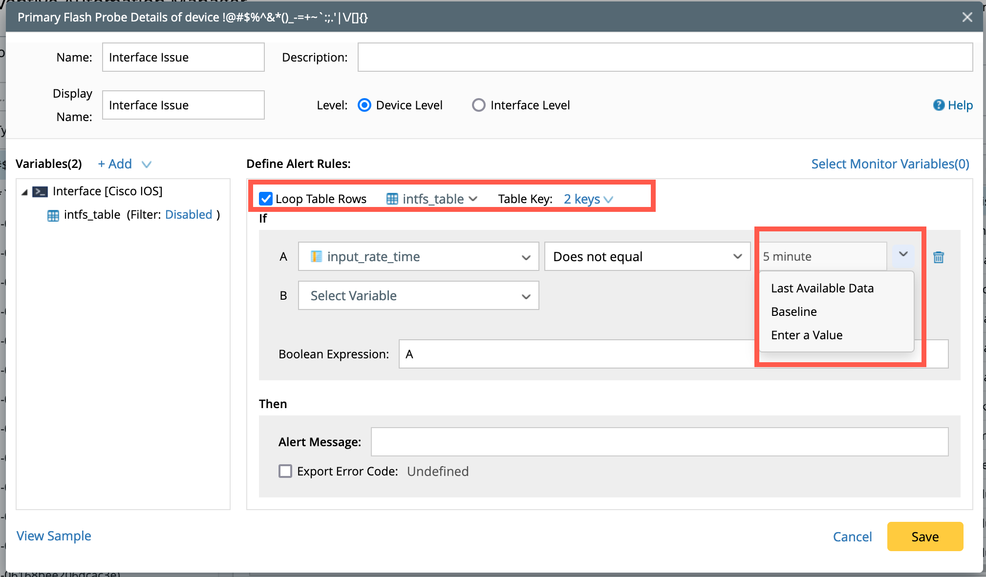 - Enter a Value: Manually define the value, for example select a variable (input_rate_time), condition (Does not equal) and enter a value such as 5 minutes.