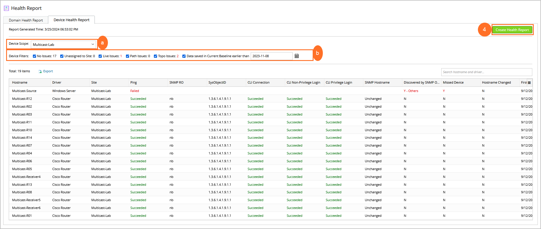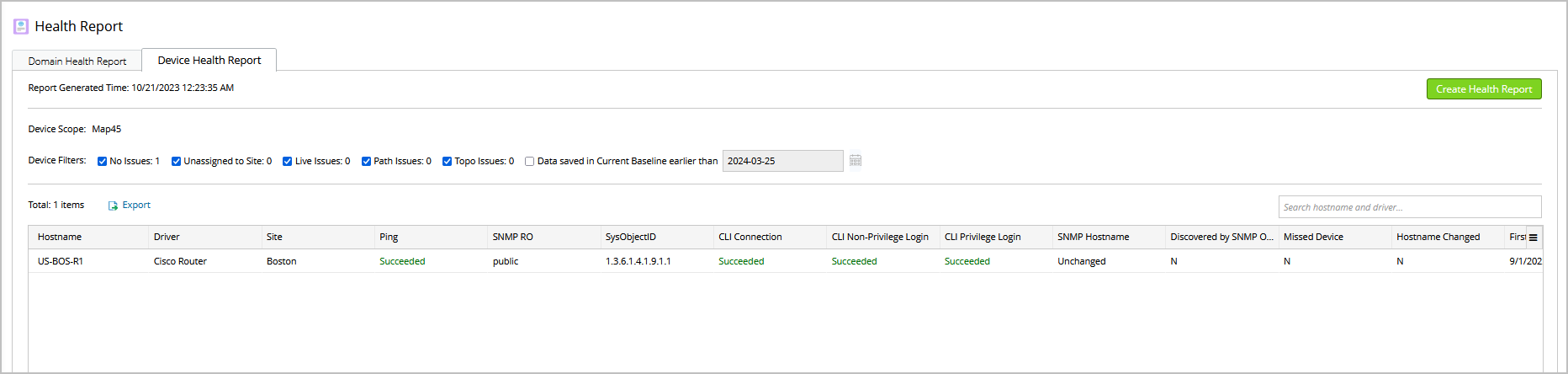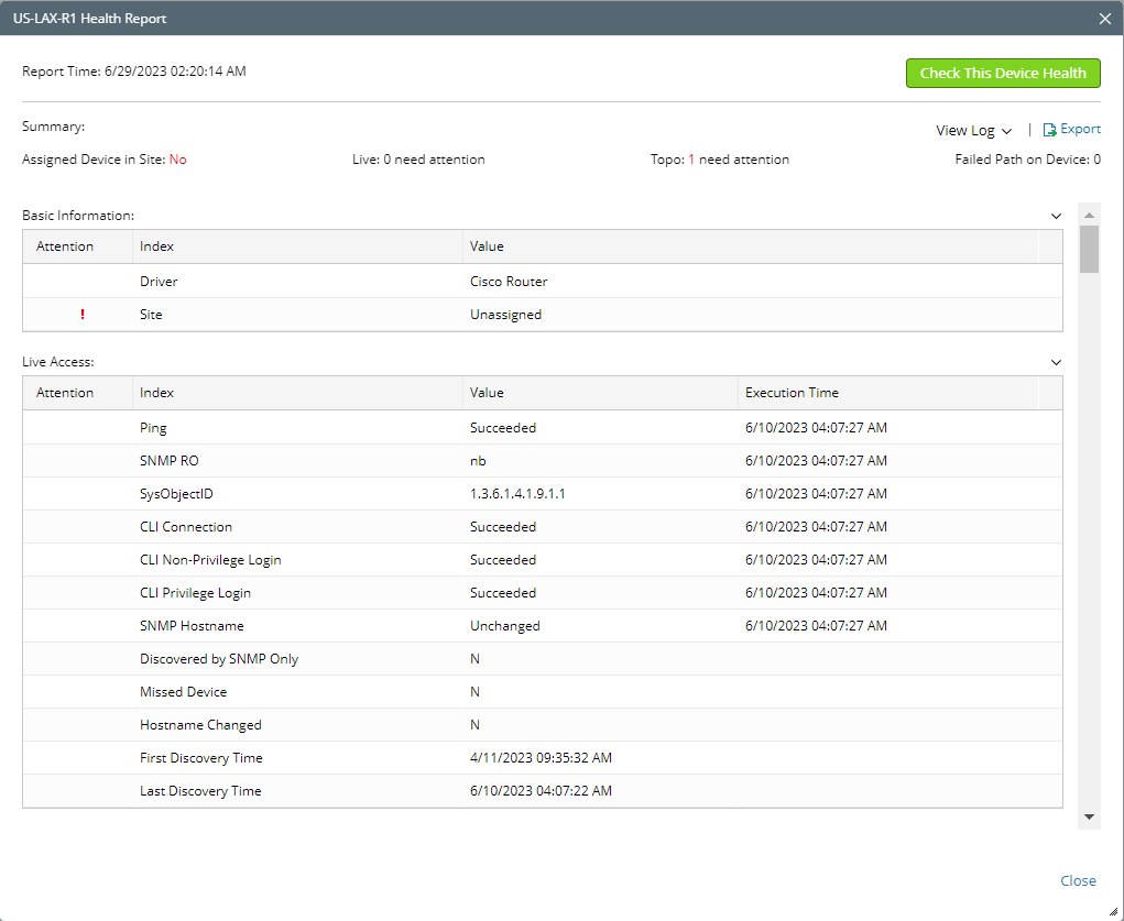 When working on a map, you may run into various anomalies of devices, such as a live access issue, a topology issue, or a path calculation failure across a device. Device Health Report provides device-level health status to help with map success.