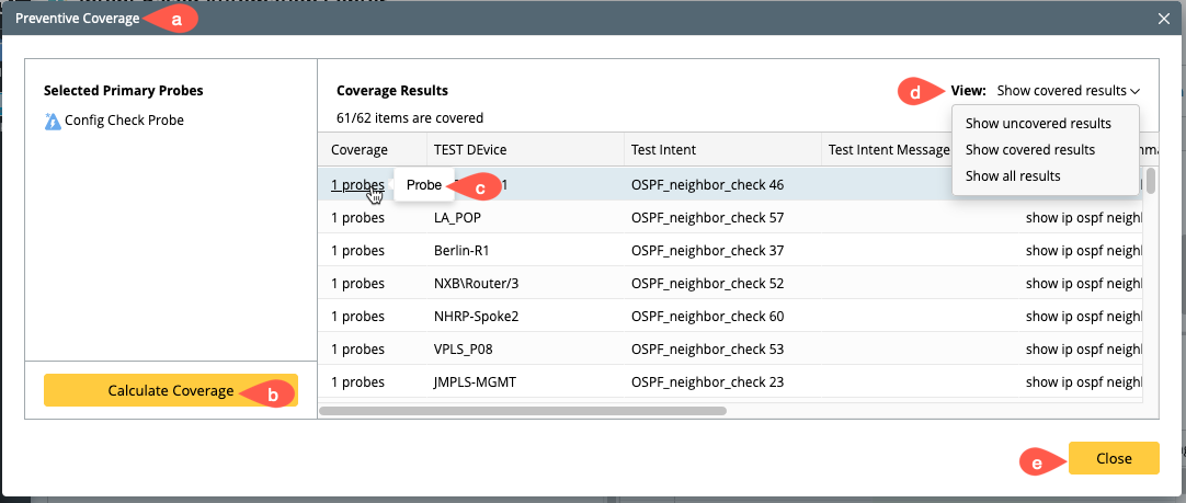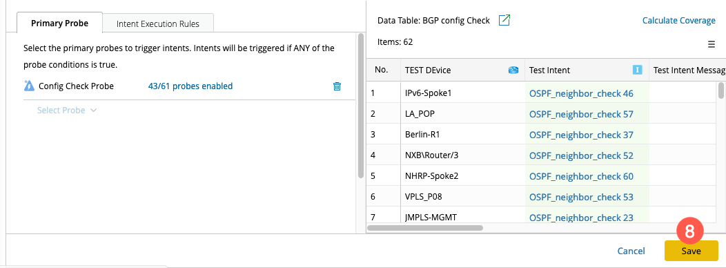 - Coverage Calculation: Calculate the primary probe coverage for all the ADT entries to check whether probes are configured for each row that need to execute intent. And the number of configured probes will be displayed.