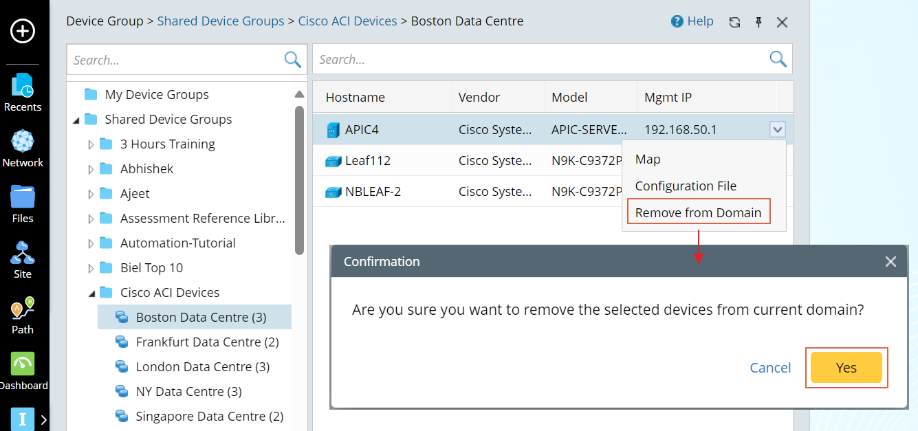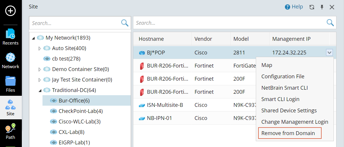 NetBrain provides many ways to remove devices from a domain and user can select either of the following ways to remove devices: