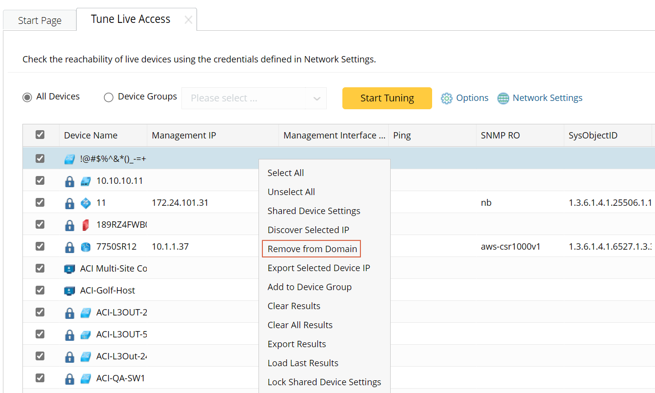 - On the Tune Live Access tab, open the fine tune result table, check the box and right-click the target device to select Remove from Domain.
