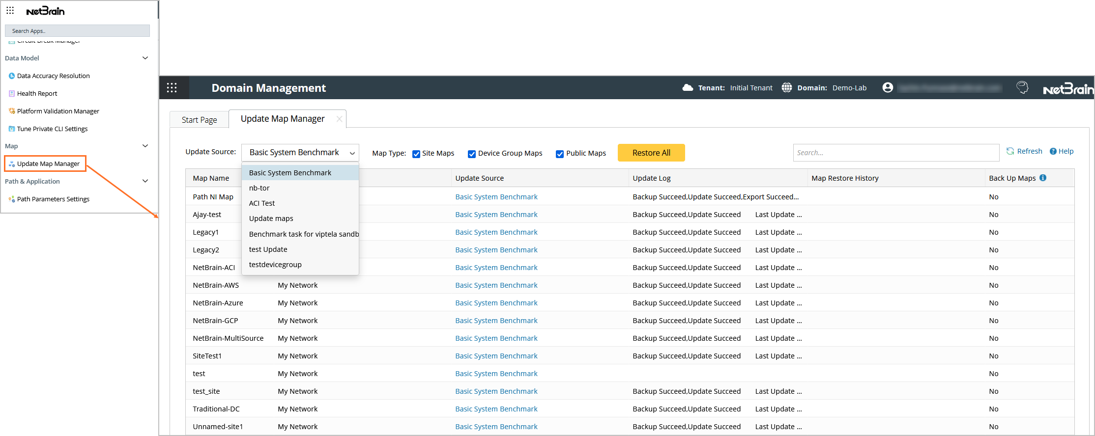 , and search for Update Map Manager. - On the Update Map Manager tab, all the maps updated through benchmark tasks are listed. You can click a link in the Update Source column to go to the benchmark task.