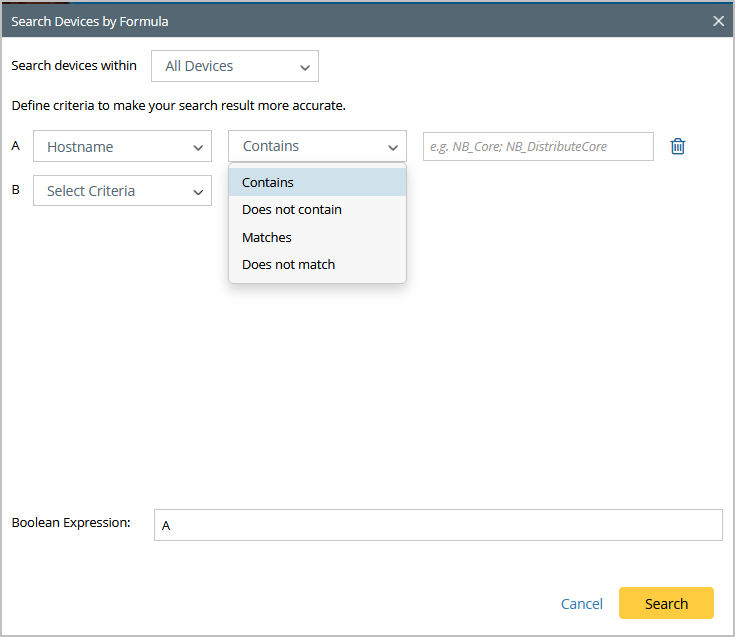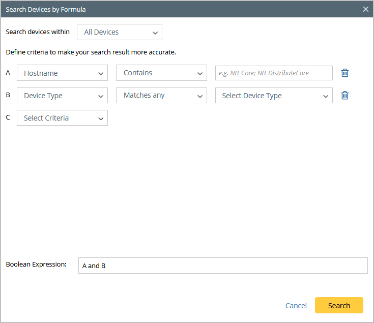 Search Devices by Formula allows you to build complex search queries to search for devices by using multiple search criteria and a Boolean expression.