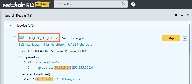 Click the IP address of the target interface. The system automatically starts a new search using the IP address as the keyword.
