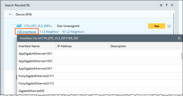 - Click the <number> Interfaces hyperlink (for example, 158Interfaces) to open the interface list of the device.
