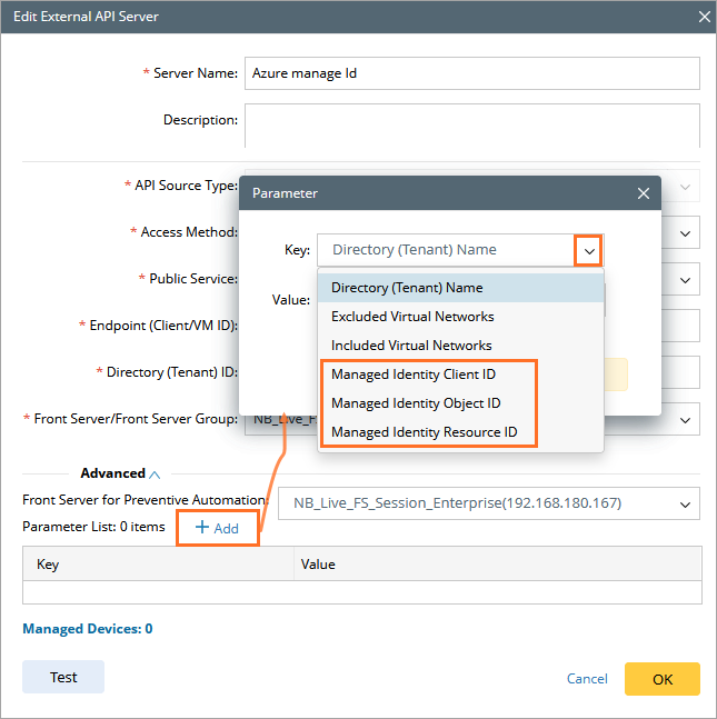 - Front Server/Front Server Group: select one front server VM with managed identity to access Azure.