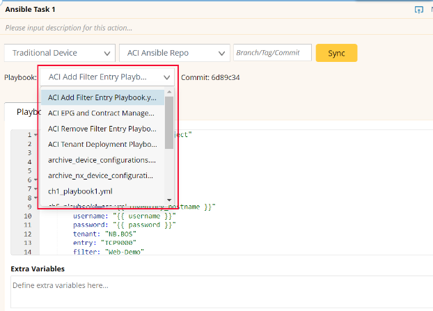 - Click Sync to retrieve the latest version file from SCM. You can enter Branch/Tag/Commit to search the related playbooks.