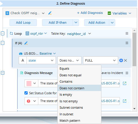 A variable can be a single variable such as $state or a table (paragraph, collector). For the table/paragraph/collector variable, you can add the Loop node for the system to loop through each table's row. Take the OSPF neighbor table as an example. There are four lines of neighbor information in the CLI result (the blue rows on the left). The diagnosis execution will determine whether the state contains full line by line (four lines in total).