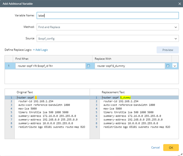 - Select one source variable to locate the text lines having characters to be replaced. If variable is inserted (in the current use case, variable $ospf_id is inserted), it will be converted to variable template for finding texts to be replaced.