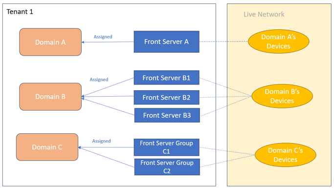 - Before assigning the Front Server, a domain can discover all devices within the same tenant. For example, Domain A can discover all devices in the live network. Front Server A, B1, B2, B3, Front Server Group C1, and C2 are all available to Domain A.