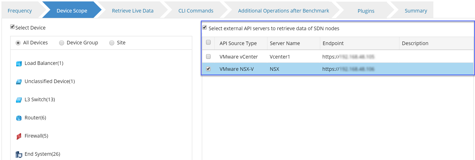 - On the Device Scope tab, check the Select external API servers to retrieve data of SDN nodes check box and select an NSX-V server.