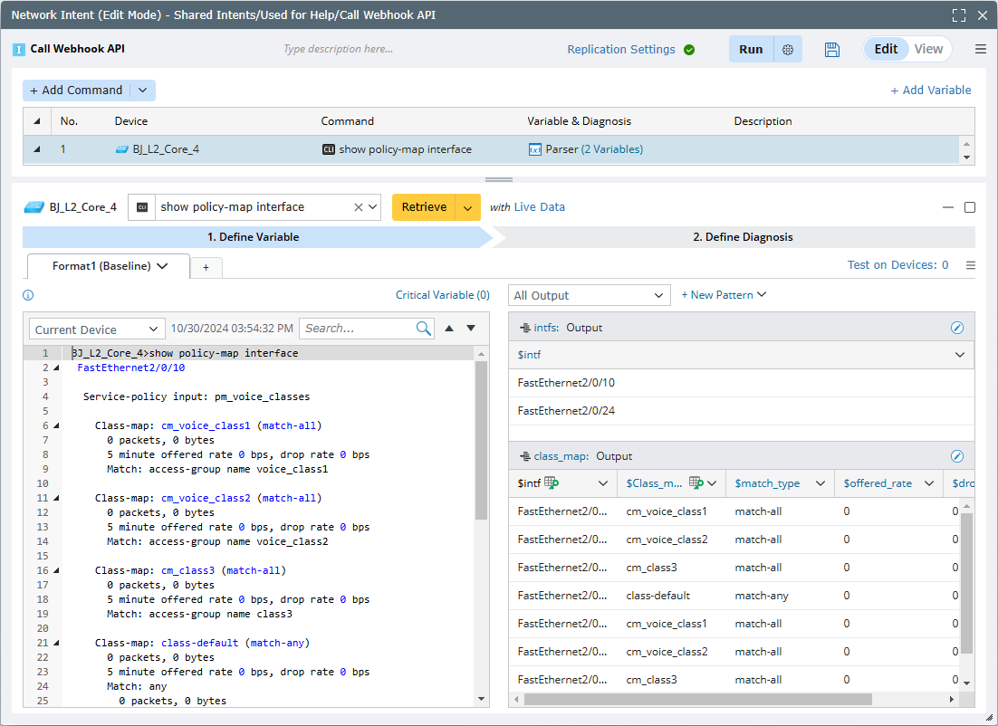 - Add CLI diagnosis for device “BJ_L2_Core_4”. Get a parsed table by command show policy-map interface.