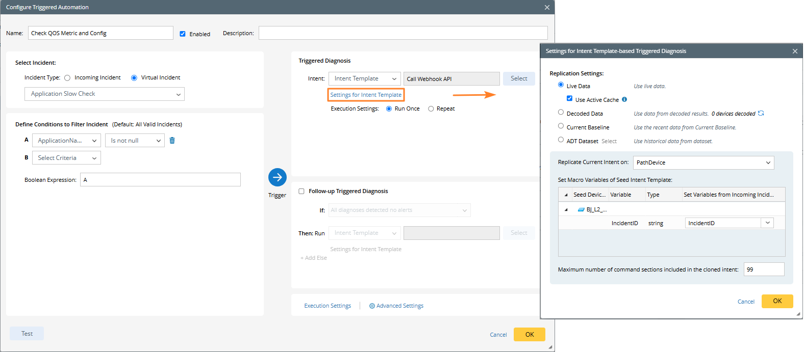 - Install this intent as a template to TAF, and associate it with the “Application Slow Check” virtual incident type.