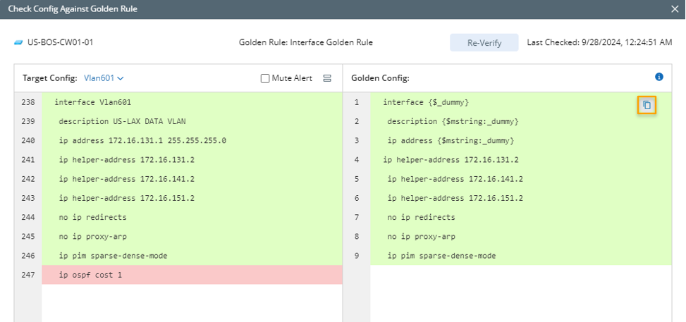 - Copy target config and golden config: To document the target config or golden config to check the matched/unmatched lines later, copy target config and golden config by hovering over the config and clicking the