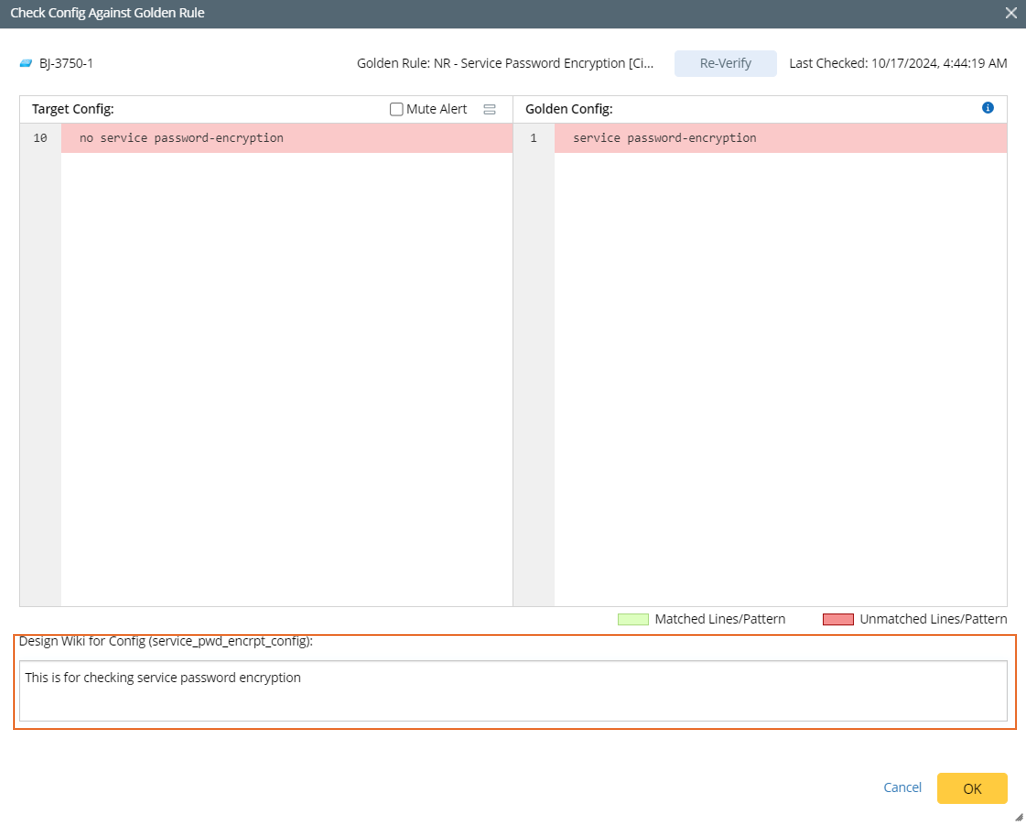 Check Config Against Golden Rule Window can show details of the Golden Config Check results of the current rule & device at instance level. Users can manually verify the current Golden Config Rule in this window to get the latest results. The core logic of the Golden Config Check involves matching the config instance's config-let lines with the pattern defined in the corresponding Golden Config Template to identify both matched and unmatched lines.